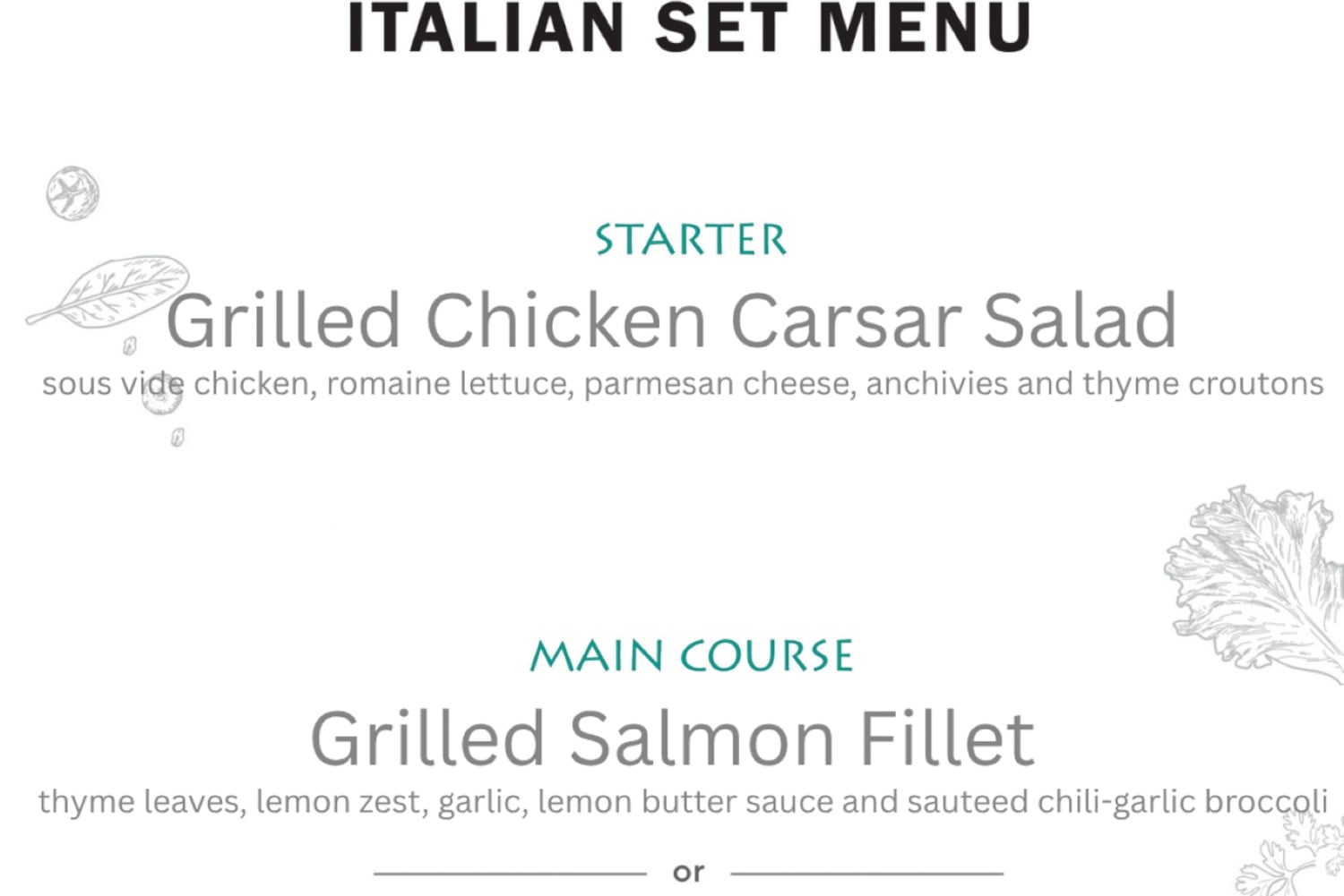 - Elige un menú fijo para el almuerzo o la cena (de 11:00 a medianoche). Indica la hora de llegada que prefieras.