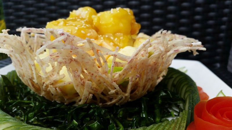 El menú refleja un excelente espectro de elección tanto en cocina europea especializada como tailandesa. Los platos se preparan diariamente con ingredientes frescos, ya sea hierbas, verduras, carne o pescado (el pescado se compra a pescadores locales, no en el mercado). Nuestro pan se hace en casa en nuestra cocina al igual que nuestra pasta fresca. Tortelloni de calabaza, tagliolini de langosta o ravioli de cangrejo fresco son las mejores opciones. Salsas caseras frescas, desde cero, con una elección predominante para minimizar el uso de ingredientes artificiales o conservantes. En la cocina tailandesa, el picante se ajusta al gusto. Todos los postres son elaborados y cobran vida en nuestra propia cocina. Deja siempre un buen espacio para el postre: cerezas amarena divinas, milhojas con fresas frescas o fondant de chocolate con coulis de frambuesa con helado de vainilla con especias de naranja. Estas son solo tres de las 10 deliciosas opciones.
