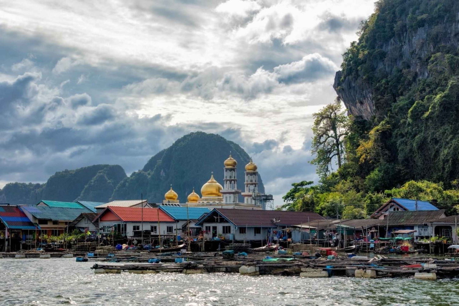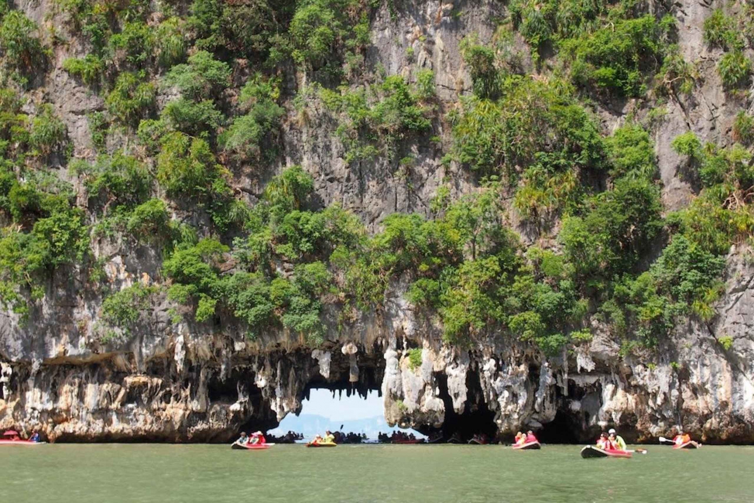 Embark on an unforgettable day trip from Phuket that offers the perfect blend of adventure, natural beauty, and cultural experiences. Start your journey with a visit to the iconic Monkey Cave (Suwankuha Temple), a serene temple nestled inside a limestone cave. Here, you’ll marvel at the golden reclining Buddha and observe playful monkeys roaming the area, adding a lively touch to this sacred site. Next, board a traditional longtail boat to explore the breathtaking Phang Nga Bay, renowned for its emerald-green waters, dramatic limestone karsts, and serene mangrove forests. The boat ride allows you to immerse yourself in the tranquil beauty of this world-famous bay, capturing panoramic views of its unique landscapes. Stop for lunch at the charming Fisherman Village, where you’ll enjoy a freshly prepared seafood meal. The village, built on stilts over the water, provides an authentic glimpse into the traditional way of life for local fishing communities. The laid-back ambiance and delicious cuisine make this a highlight of the day. Continue your adventure with a visit to the legendary James Bond Island (Khao Phing Kan), made famous by the movie The Man with the Golden Gun. This island’s towering limestone cliffs and picturesque surroundings make it one of Thailand's most photographed landmarks. Finally, cap off your day with an exhilarating sea canoeing experience at Talu Island, where you’ll paddle through sea caves, tunnels, and hidden lagoons. Discover the intricate rock formations and serene waters that define the island's unique charm. This activity is both relaxing and thrilling, offering a close-up view of Phang Nga Bay’s natural wonders.Includes