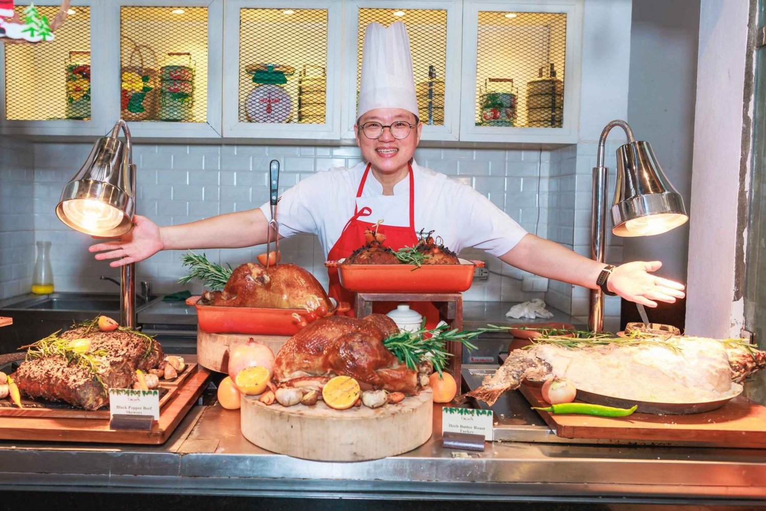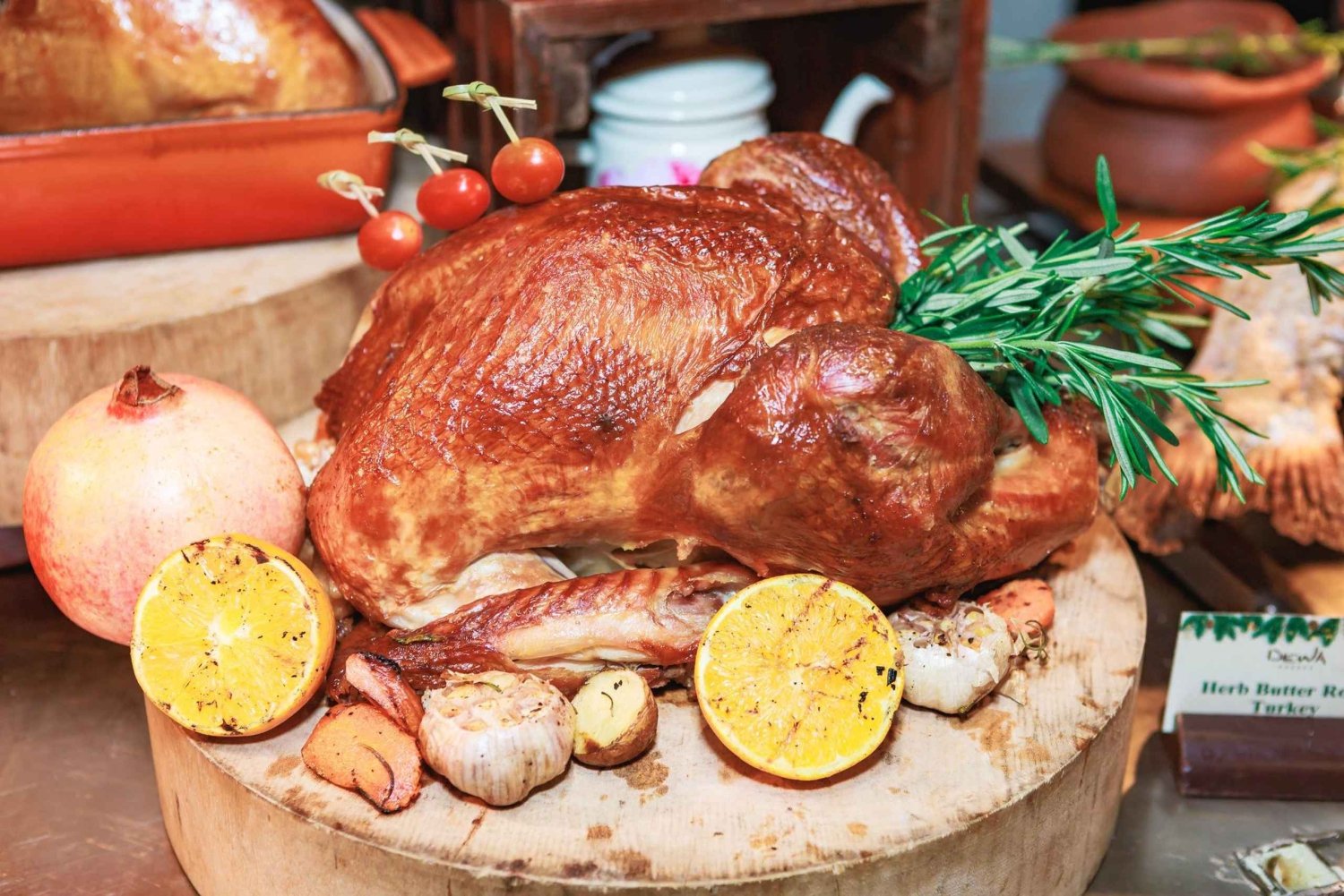 Rôti de bœuf en croûte d'herbes, roulade de dinde farcie ou sushis de Noël, pâtes crémeuses de Noël et cheesecake aux baies, avec une visite spéciale du Père Noël.Easy cancellation