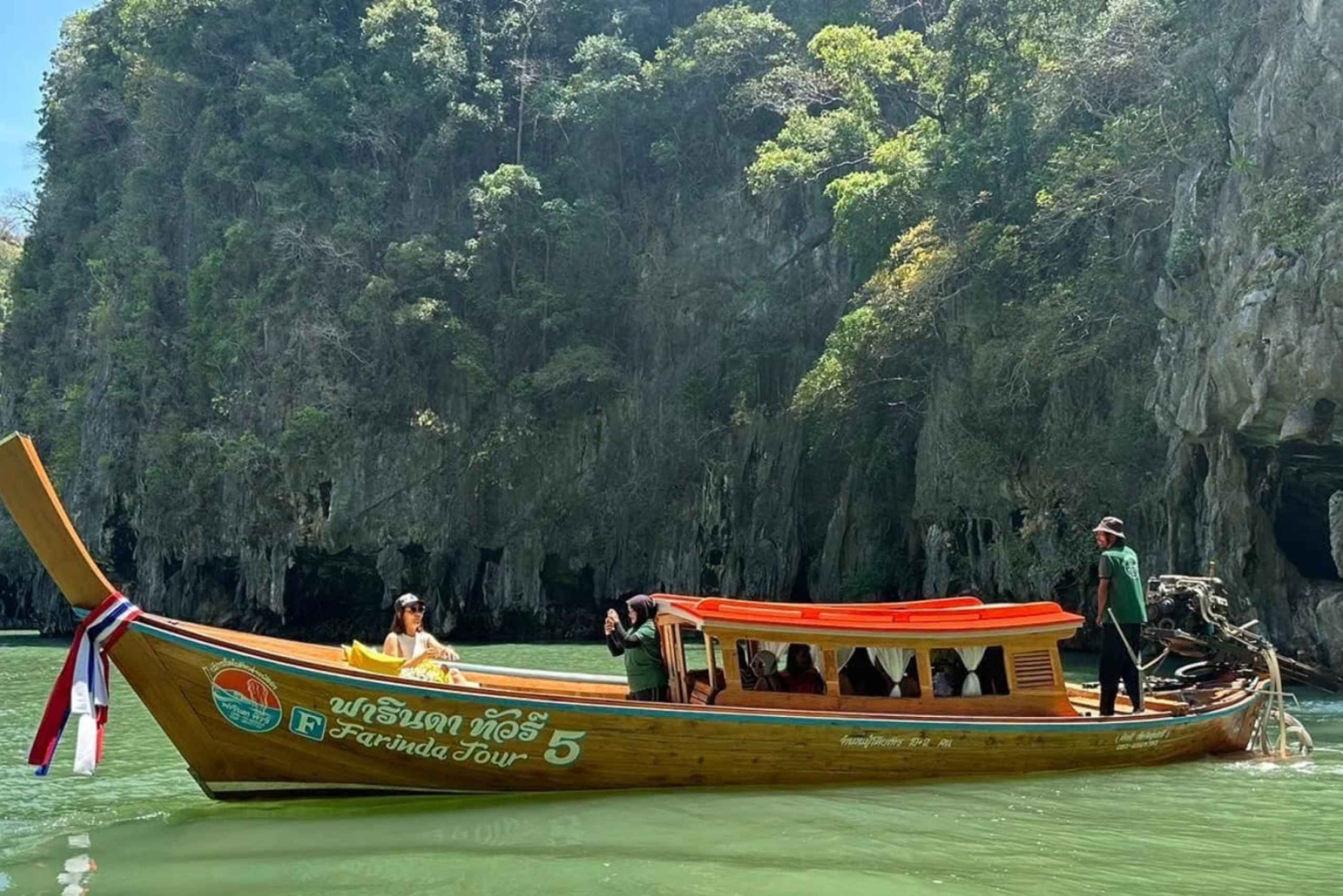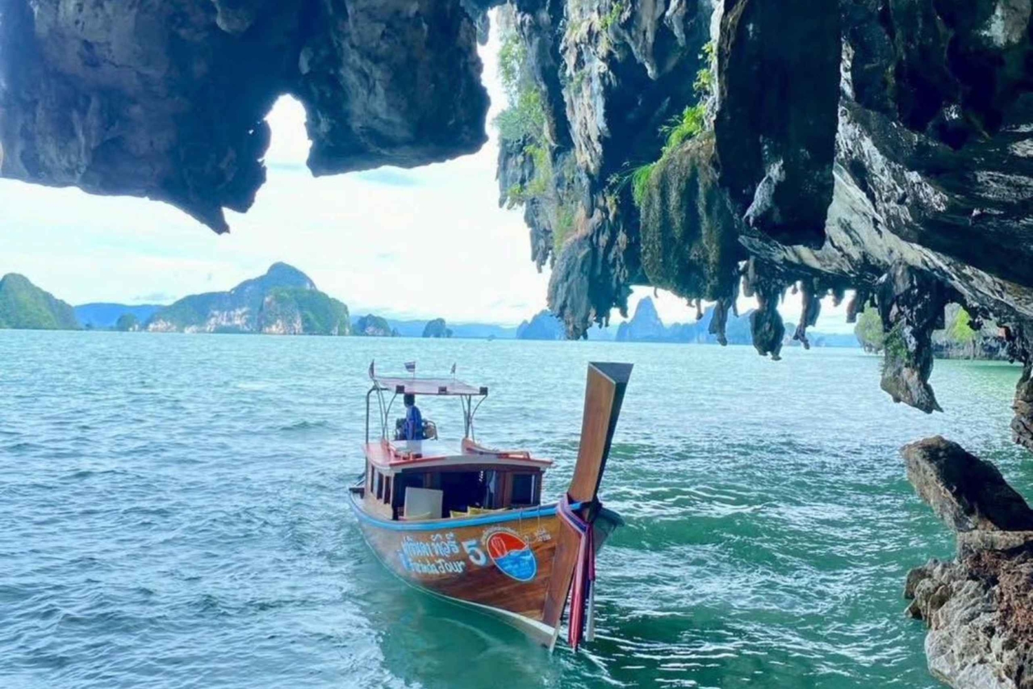 Explorez la baie de Phang Nga lors d'une sortie en bateau à longue queue privé depuis Phuket. Visitez le belvédère de Samet Nangshe, l'île de James Bond et Koh Hong. Profitez d'un pique-nique et de boissons à bord.