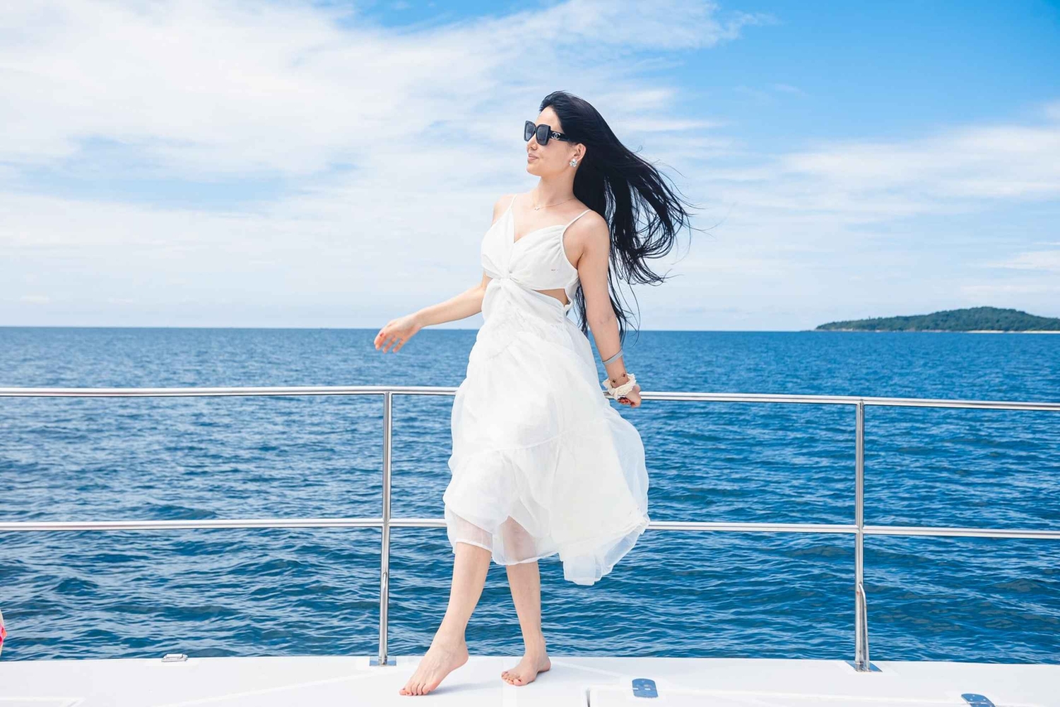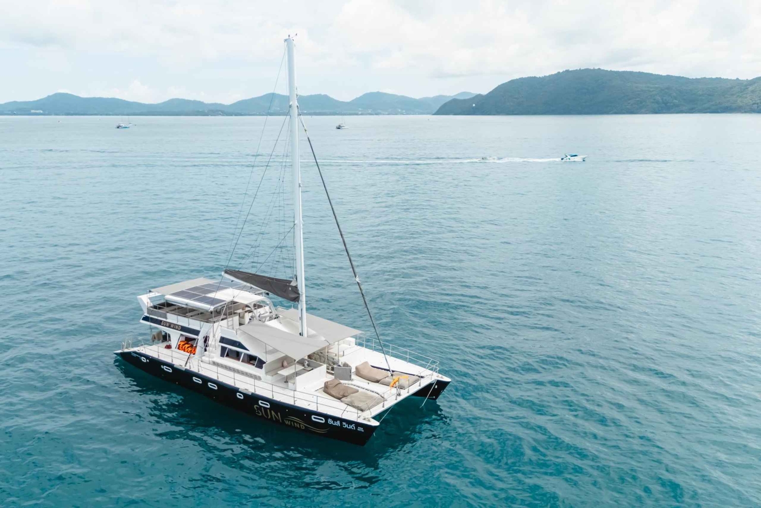푸켓에서 럭셔리 카타마란으로 출항해 태양 아래에서 즐거운 하루를 보내세요. 넷 라운지에서 휴식을 취하거나 라이브 DJ의 비트에 맞춰 춤을 추며 바다 위에서 폼 파티를 즐기세요. 라차 섬에서 수영, 스노클링, 또는 워터 액티비티를 즐기세요. 차롱 피어에 도착해 카타마란에 탑승하기 전 체크인하세요. 넷 라운지에서 휴식을 취하거나 바다 위를 떠다니거나, 편안한 객실로 이동해 파티에서 벗어나 평화로운 시간을 보내세요. 세계적인 라이브 DJ의 짜릿한 비트에 맞춰 춤을 추며 파라다이스 사이를 항해하세요. 바다에서 폼 파티를 즐기고 프로메트 곶에서 푸켓의 가장 화려한 일몰을 감상하세요. 코랄 섬의 바나나 비치, 푸켓에서 가장 아름다운 해변 중 하나에 정박합니다. 라차 섬으로 출발해 수영, 스노클링, 또는 물놀이를 즐기세요. 선상에서 고급 버퍼 런치와 신선한 재료와 프리미엄 재료가 조화롭게 어우러진 정성스럽게 준비된 메뉴를 즐기세요.Includes