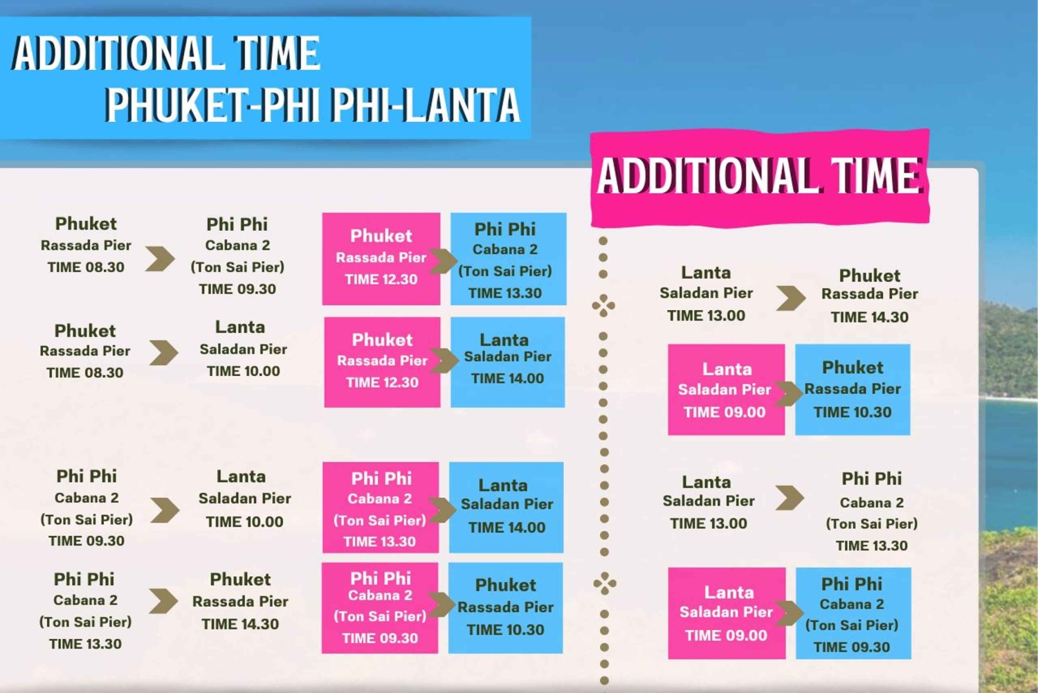 - - 호텔 픽업 시간은 예약 시 선택하신 일정과 다를 수 있습니다. 표시된 시간은 보트 출발 시간표입니다. - 코피피에서 푸켓으로 가는 옵션은 호텔 픽업 서비스가 제공되지 않습니다. - 푸켓에서 코피피행 옵션의 경우 파통, 카타, 카론 및 푸켓 타운에 있는 호텔에서만 호텔 픽업 서비스를 이용하실 수 있습니다. 픽업 일정: - 카타 내 호텔 - 오전 6시 30분 - 카론 내 호텔 - 오전 6시 45분 - 빠통 비치 내 호텔 - 오전 6시 50분 - 푸켓 타운 내 호텔 - 오전 7시 50분