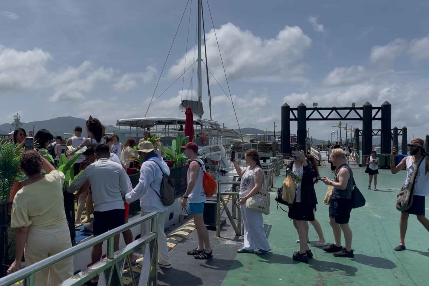 Utforsk de fantastiske øyene Coral og Racha på Phukets største katamaran – «Say Hi Fiesta». Denne endagsturen lover et fantastisk maritimt eventyr med muligheter for snorkling, dykking, masse vannaktiviteter ombord og soling. Når dagen nærmer seg slutten, kan du nyte en deilig grilling ved solnedgang og båtfest om bord, noe som gjør dette til en uforglemmelig opplevelse midt i den vakre Andamanhavet. Reiseplan for «Say Hi Fiesta»: 9:00–9:30 | Sømløs henting på hotellet Luksuriøs transport med aircondition med henting over hele øya og flerspråklig støtte (hentetidspunktet kan være tidligere på grunn av avstand, spesifikke detaljer vil bli bekreftet via e-post). 10.00 | Velkomst på bryggen Profesjonell velkomst og rask innsjekking på Chalong brygge. 10.30 | Sett seil Start havets odyssé med en overdådig velkomstbrunsj med en rekke gourmetretter, frisk frukt og herlige godbiter. Ekspertguidene våre deler øyens hemmeligheter mens fotografer fanger eventyret ditt. 11.30 | Koralløya Slapp av på Long Beachs vidstrakte strender. Velg mellom strandturer/snorkling/bananbåt/parasailing/sjøvandring, eller bare slapp av med gratis VIP-solsenger. 12.30–14.00 | Gourmetlunsjcruise Nyt en utsøkt buffé mens du cruiser til Racha Island, med panoramautsikt over havet. 14.00–16.00 | Racha Island Gå på den puddermyke sanden der turkisblått vann (synlighet 15–25 m) avslører blomstrende koralløkosystemer. Svøm sammen med papegøye-fisk, englefisk og grasiøse havskilpadder i løpet av to uforglemmelige timer. Slapp av på stranden, nyt snorkling i kaleidoskopiske rev, vannsport om bord (slider/flytende basseng/flytende matte/paddleboard/undervannsscooter). Eller velg adrenalinpumpende tillegg (avgift gjelder): Bananbåttur/parasailing/PADI 5-stjerners dykking (for sertifiserte dykk ≈1 time, gi mannskapet beskjed på forhånd). 17.00–18.30 | Promthep solnedgangscruise og grilling Unn deg vår signatur solnedgangscruise med live grilling, musikk og dans mens himmelen forvandles til gylne nyanser. 18.30 | Returreise Komfortabel transport tilbake til overnattingsstedet ditt med varige minner om paradis.Includes