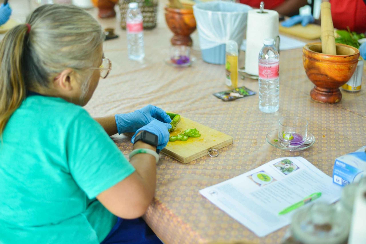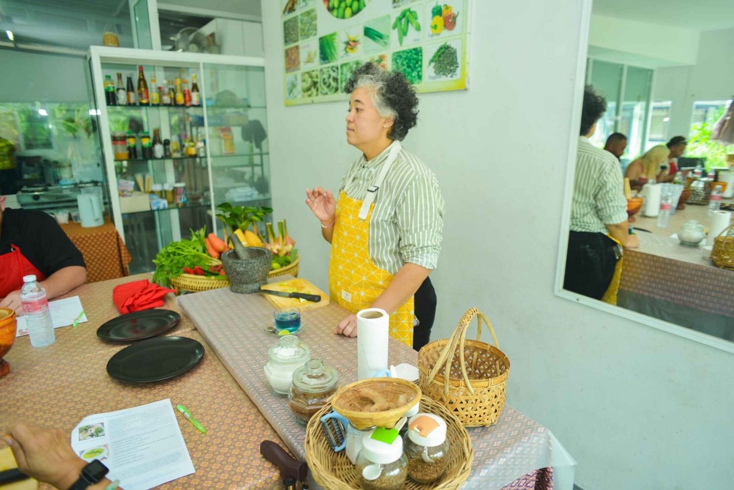 - Понедельник: Утреннее занятие, Том Ям Кунг, Пхад Тай, Зеленый Карри и Манговый клейкий рис. Дневное занятие, Куриный Сатай, Том Кха Кай, Пхад Си-Ю и Манговый клейкий рис. Вторник: Утреннее занятие, Рыбный пирог, Салат из папайи, Пананг Карри и Жареный Банан. Дневное занятие, Том Ям Кунг, Пхад Тай, Зеленый Карри и Жареный Банан. Среда: Утро, Том Ям Кунг, Пхад Тай, Зеленый Карри и Банан в Кокосовом Молоке. Дневное занятие, Жареная Курица с Орехами Кешью, Том Кха Кай, Жареные Листья Базилика и Банан в Кокосовом Молоке. Четверг: Утро, Спринг Роллы, Пананг Карри, Том Кха Кай и Манговый клейкий рис. Дневное занятие, Том Ям Кунг, Пхад Тай, Зеленый Карри и Манговый клейкий рис. Пятница: Утро, Том Ям Кунг, Пхад Тай, Зеленый Карри и Жареный Банан. Полдень, Жареная Курица в Устричном Соусе, Спринг Ролл, Том Кха Кай и Жареный Банан. Суббота: Утро, Массаман Карри, Спринг Роллы, Том Ям Кунг и Банан в Кокосовом Молоке. Полдень, Красный Карри, Ларб, Том Ках Кай и Банан в Кокосовом Молоке.